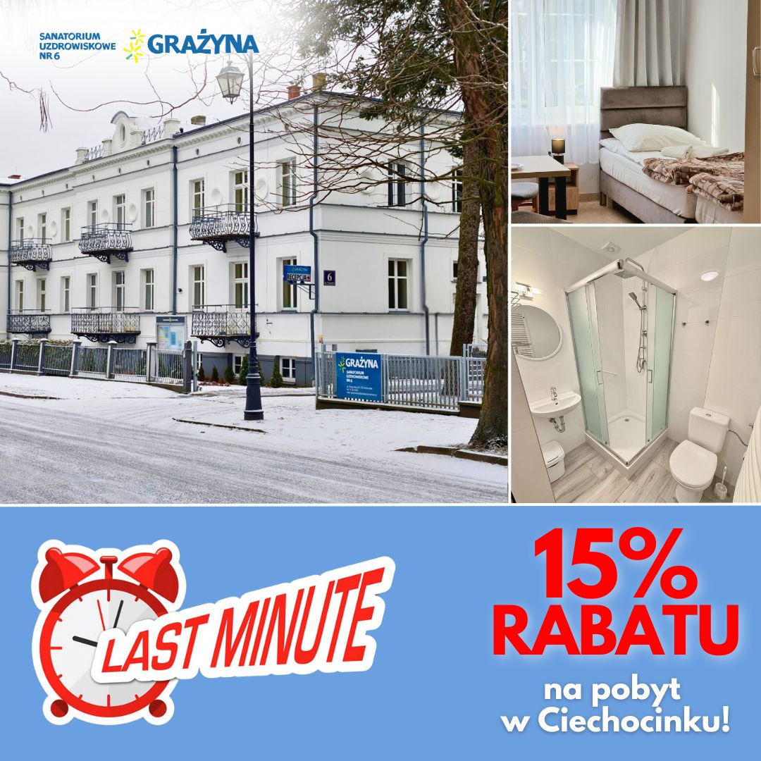 Sanatorium Uzdrowiskowe „Grażyna” to zabytkowy, niezwykle popularny wśród kuracjuszy obiekt, zlokalizowany w samym sercu uzdrowiska. Bezpośrednie sąsiedztwo Parku Zdrojowego oraz fontanny „Grzybek” tworzy idealne warunki do wypoczynku, regeneracji i korzystania z uroków Ciechocinka.
