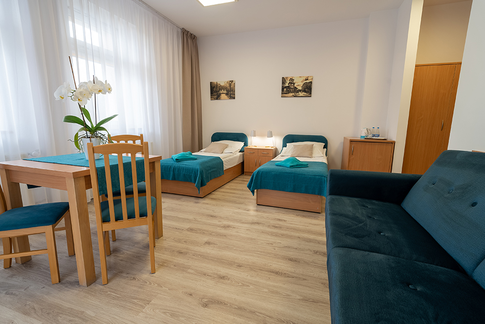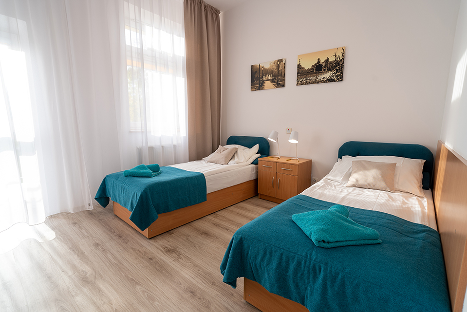 Na Gości czekają przytulne, funkcjonalne pokoje 1-, 2- i 3-osobowe z łazienkami, wyposażone w telewizor, lodówkę i czajnik bezprzewodowy, oraz dostęp do bezpłatnego Internetu Wi-Fi. Wnętrza utrzymane są w jasnej, przyjaznej stylistyce, sprzyjającej relaksowi i regeneracji po zabiegach.